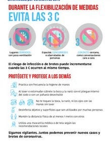 Esta infografía enfatiza el evitar las 3 Cs, lugares cerrados, concurridos y el contacto cercano con otras personas.