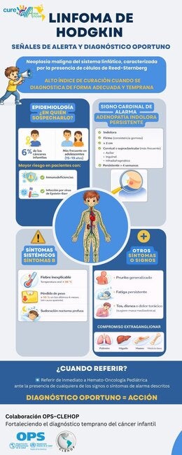 Esta infografía presenta las señales de alerta del linfoma de Hodgkin y orienta sobre cuándo referir al paciente a un servicio especializado. La infografía ha sido elaborada por la OPS y el Consorcio Latinoamericano de Enfermedades Hemato-Oncológicas Pediátricas (CLEHOP) en el marco de la colaboración para fortalecer las capacidades de los equipos de salud para el diagnóstico temprano y el abordaje inicial del Linfoma de Hodgkin en niñas, niños y adolescentes. Enlaces relacionadosWebinar: Diagnóstico temprano del Linfoma de Hodgkin pediátrico (realizado el 24 de febrero de 2026)