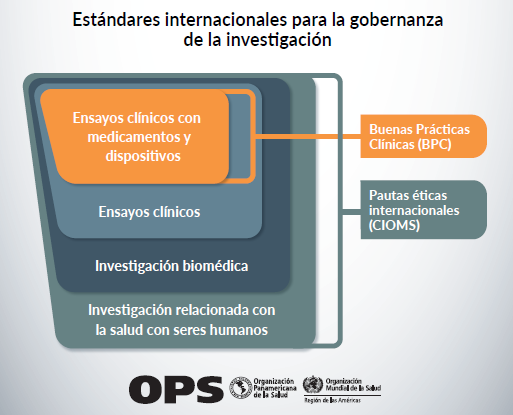 Infografía sobre la supervisión de la investigación ética relacionada con la salud con seres y la supervisión regulatoria con ensayos clínicos con medicamentos y dispositivos humanos, en concordancia con los estándares internacionales para la gobernanza de la investigación. |