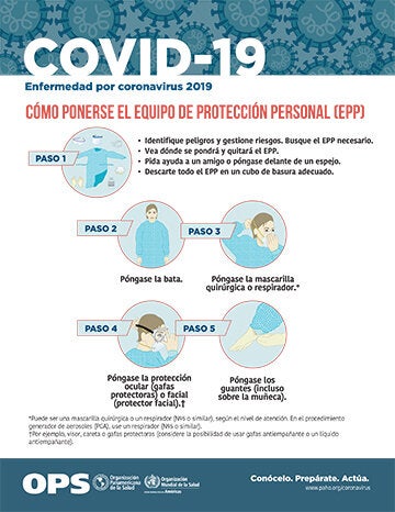 Infografía sobre como ponerse y quitarse el equipo de protección personal. Enlace a animación sobre EPP. |
