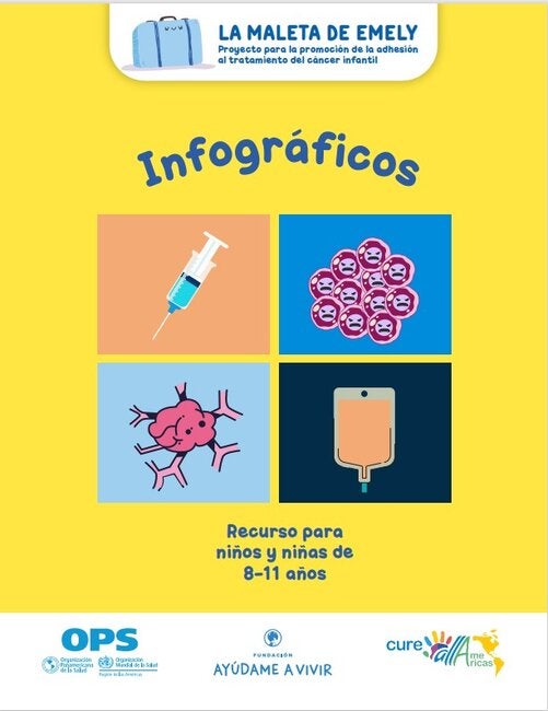 El material de los Infográficos: Recurso para niños y niñas de 8 a 11 años conforma un libro de coloreo y actividades está dirigido a pacientes oncológicos en ese grupo de edad. En él se explican las características del cáncer y cómo enfrentar los tratamientos con el acompañamiento del equipo médico y la familia. Su formato didáctico y sus explicaciones de fácil comprensión lo convierten en un material accesible e imprescindible para avanzar en el camino de superación de esta enfermedad. Sobre la serie La Maleta de Emely La Organización Panamericana de la Salud, alineada con la Iniciativa Mundial CureAll, se propone contribuir a la reducción de los factores que empujan a la baja la tasa de supervivencia de cáncer infantil en la Región; entre ellos, la escasa adhesión al tratamiento o su abandono. La Maleta de Emely es un proyecto dirigido a frenar estos factores a través del desarrollo de materiales educativos para informar a los niños, niñas y adolescentes con cáncer sobre su enfermedad. El desarrollo de programas relacionados con el cáncer infantil que, como este, hacen de la familia y del propio paciente sus estándares de atención, requiere considerar la diversidad de las perspectivas de los destinatarios, sus miedos y necesidades, así como sus preferencias, sensibilidades y capacidades de acceso a la información. Por eso, la serie La Maleta de Emely ha sido diseñada en segmentos según tres grupos etarios: 4-7 años, 7-11 años y 12+ años, dentro de los cuales se abordan con herramientas adaptadas el concepto mismo de cáncer, los tratamientos y sus efectos secundarios, y la importancia del autocuidado. Los voluntarios clínicos, piedra angular de este proyecto, presentarán, en el transcurso de varias sesiones, los diversos materiales a los pacientes de reciente diagnóstico. |