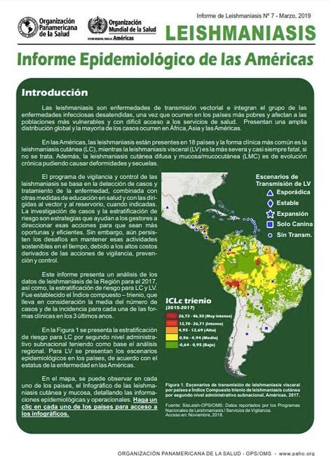 Sin embargo, aún persisten los desafíos en mantener esas actividades sostenibles en el tiempo, debido a los altos costos derivados de las acciones de vigilancia, prevención y control. Este informe presenta un análisis de los datos de leishmaniasis de la Región para el 2017, así como, la estratificación de riesgo para LC y LV. Fue establecido el Índice compuesto – trienio, que lleva en consideración la media del número de casos y de la incidencia para cada una de las formas clínicas en los 3 últimos anos.
