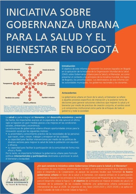 El objetivo de este informe es compartir los avances logrados en Bogotá en la aplicación de la Iniciativa de la Organización Mundial de la Salud (OMS) sobre Gobernanza Urbana para la Salud y el Bienestar. Presenta el contexto y los principios de la iniciativa mundial, los logros alcanzados en Bogotá y los próximos pasos. Los destinatarios de este informe son funcionarios municipales, gobiernos nacionales y donantes. La gobernanza urbana para la salud y el bienestar se refiere a los procesos de interacción y posterior toma de decisiones para generar soluciones colectivas que mejoren la salud y el bienestar mediante prácticas de cocreación, cambio social y compromiso institucional como parte de los enfoques de todo el gobierno y toda la sociedad. |