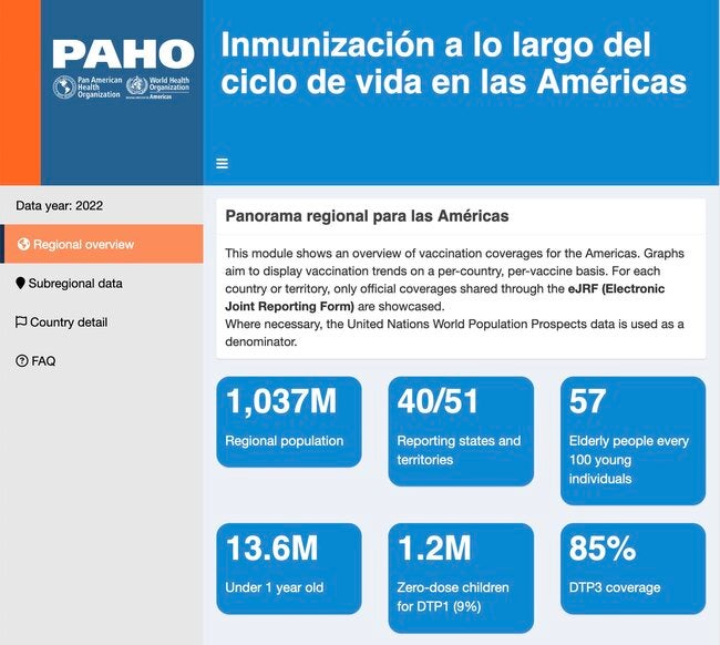 Panorama regional para las AméricasEste módulo muestra una visión general de las coberturas de vacunación en las Américas. Los gráficos tienen como objetivo mostrar las tendencias de vacunación por país y por vacuna. Para cada país o territorio, solo se muestran las coberturas oficiales compartidas a través del eJRF (formulario electrónico de notificación conjunta).