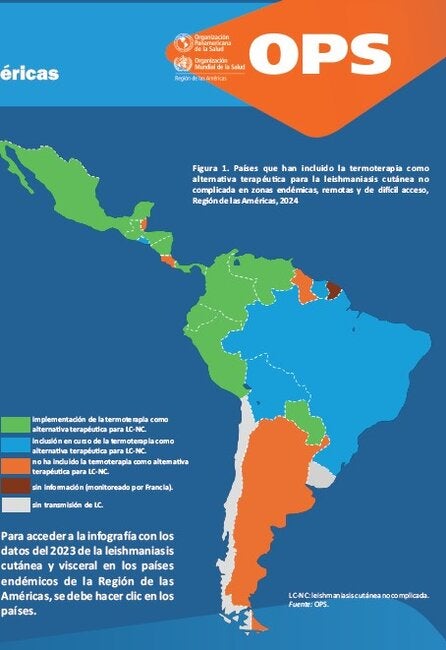 Este informe presenta la tendencia de las leishmaniasis y un análisis detallado de los datos correspondientes al 2023 de las distintas formas clínicas de esta enfermedad en la Región de las Américas. Además, se incluye una serie de infografías con datos específicos de la leishmaniasis cutánea (LC), mucosa (LM) y visceral (LV) en los países con endemicidad. Al largo de los años, se observa una tendencia en la disminución de casos de la leishmaniasis; sin embargo, cuando se analizan por separado los datos por países, se verifica que la tendencia de casos de LV es creciente en Argentina y Paraguay, y la de LC, en Argentina, Costa Rica, Ecuador, México y Suriname. |
