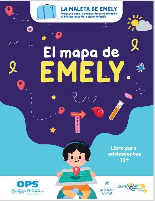 El mapa de Emely es un libro de actividades para niños y niñas de 12 años y más en tratamiento oncológico. En él se explican las características del cáncer y cómo enfrentar los tratamientos con el acompañamiento del equipo médico y la familia. Su formato didáctico y sus explicaciones de fácil comprensión lo convierten en un material accesible e imprescindible para avanzar en el camino de superación de esta enfermedad. Sobre la serie La Maleta de Emely La Organización Panamericana de la Salud, alineada con la Iniciativa Mundial CureAll, se propone contribuir a la reducción de los factores que empujan a la baja la tasa de supervivencia de cáncer infantil en la Región; entre ellos, la escasa adhesión al tratamiento o su abandono. La Maleta de Emely es un proyecto dirigido a frenar estos factores a través del desarrollo de materiales educativos para informar a los niños, niñas y adolescentes con cáncer sobre su enfermedad. El desarrollo de programas relacionados con el cáncer infantil que, como este, hacen de la familia y del propio paciente sus estándares de atención, requiere considerar la diversidad de las perspectivas de los destinatarios, sus miedos y necesidades, así como sus preferencias, sensibilidades y capacidades de acceso a la información. Por eso, la serie La Maleta de Emely ha sido diseñada en segmentos según tres grupos etarios: 4-7 años, 7-11 años y 12+ años, dentro de los cuales se abordan con herramientas adaptadas el concepto mismo de cáncer, los tratamientos y sus efectos secundarios, y la importancia del autocuidado. Los voluntarios clínicos, piedra angular de este proyecto, presentarán, en el transcurso de varias sesiones, los diversos materiales a los pacientes de reciente diagnóstico. |
