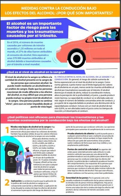 El alcohol es un importante factor de riesgo para las muertes y los traumatismos causados por el tránsito. Medidas contra la conducción bajo los efectos del alcohol son importantes para reducir el uso nocivo del alcohol. Esta hoja informativa describe diferentes opciones de políticas que pueden ser efectivas para disminuir los traumatismos y las muertes ocasionadas por la conducción bajo los efectos del alcohol.