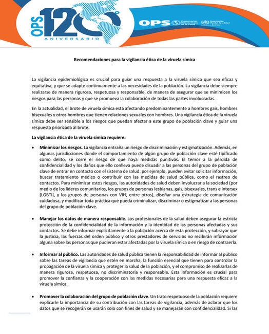 La vigilancia es una actividad esencial de la salud pública. Sin embargo, la vigilancia entraña desafíos éticos. El brote de viruela símica afecta predominantemente a hombres gais, hombres bisexuales y otros hombres que tienen relaciones sexuales con hombres. La vigilancia de la viruela símica, de manera específica, entraña los riesgos de discriminación y estigmatización, además del riesgo de las medidas punitivas en las jurisdicciones donde el comportamiento de algún grupo de población clave esté tipificado como delito. Una conciencia sobre estos riesgos y una orientación específica para abordar otros desafíos éticos son necesarias para promover la vigilancia ética de la viruela símica. Esta breve publicación da recomendaciones orientadas a asegurar que la vigilancia de la viruela símica sea realizada de manera ética. Las recomendaciones han sido elaboradas sobre la base de las pautas de la OMS sobre la ética en la vigilancia de salud pública.