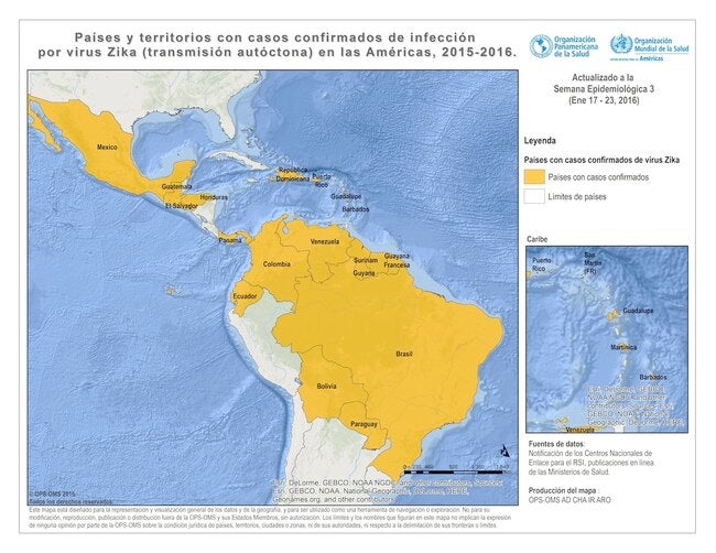 Países y territorios con transmisión autóctona de virus del zika. Semana Epidemiológica 3 - 2016