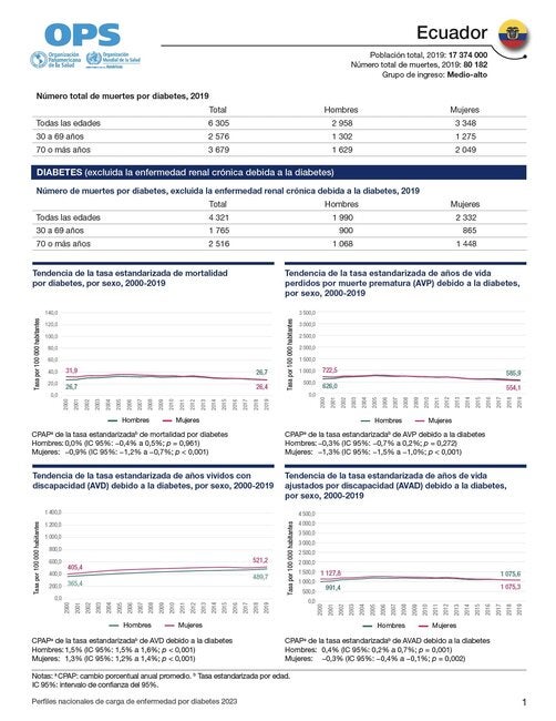 El propósito fundamental de esta serie de perfiles nacionales de la carga de enfermedad por diabetes y de enfermedad renal crónica debida a diabetes es apoyar a los países de la Región de las Américas en el seguimiento de las estrategias puestas en marcha para enfrentar la diabetes. Esta primera versión de los perfiles, que abarca el período comprendido entre el 2000 y el 2019, muestra la tendencia de la mortalidad, los años de vida perdidos por muerte prematura, los años vividos con discapacidad y los años de vida ajustados por discapacidad de ambas enfermedad. Se han elaborado con los últimos datos disponibles de las estimaciones mundiales de salud de la Organización Mundial de la Salud y tiene como objetivo convertirse en una herramienta útil para llevar a cabo el monitoreo de las estrategias conexas.