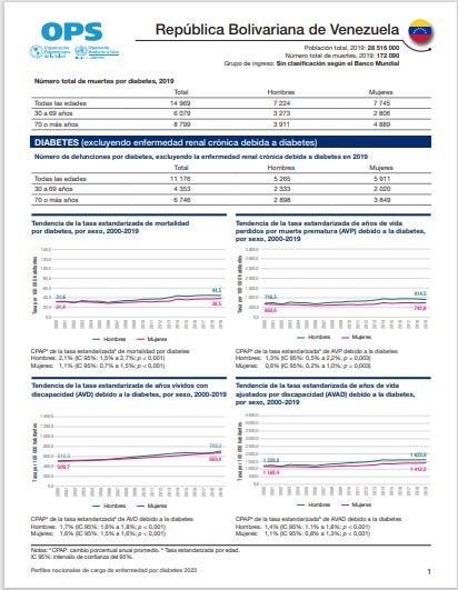 El propósito fundamental de esta serie de perfiles nacionales de la carga de enfermedad por diabetes y de enfermedad renal crónica debida a diabetes es apoyar a los países de la Región de las Américas en el seguimiento de las estrategias puestas en marcha para enfrentar la diabetes. Esta primera versión de los perfiles, que abarca el período comprendido entre el 2000 y el 2019, muestra la tendencia de la mortalidad, los años de vida perdidos por muerte prematura, los años vividos con discapacidad y los años de vida ajustados por discapacidad de ambas enfermedad. Se han elaborado con los últimos datos disponibles de las estimaciones mundiales de salud de la Organización Mundial de la Salud y tiene como objetivo convertirse en una herramienta útil para llevar a cabo el monitoreo de las estrategias conexas.