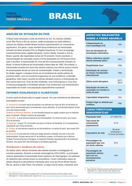 La fiebre amarilla es una enfermedad endémica en varios países de América Latina. Con vistas a brindar apoyo a los responsables de la toma de decisiones para priorizar las acciones preventivas frente a esta afección, la Organización Panamericana de la Salud presenta estos perfiles nacionales con una selección de datos concisa y exhaustiva de los países con endemicidad. En cada perfil se brinda un análisis de la situación actual del país, los factores ecológicos y climáticos asociados a la enfermedad, la distribución e incidencia de los vectores, y las claves de la actividad arboviral. Asimismo, se incluye una perspectiva histórica de la epidemiología y un resumen del estado de la vacunación contra la enfermedad en el país.