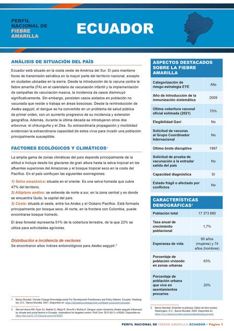 La fiebre amarilla es una enfermedad endémica en varios países de América Latina. Con vistas a brindar apoyo a los responsables de la toma de decisiones para priorizar las acciones preventivas frente a esta afección, la Organización Panamericana de la Salud presenta estos perfiles nacionales con una selección de datos concisa y exhaustiva de los países con endemicidad. En cada perfil se brinda un análisis de la situación actual del país, los factores ecológicos y climáticos asociados a la enfermedad, la distribución e incidencia de los vectores, y las claves de la actividad arboviral. Asimismo, se incluye una perspectiva histórica de la epidemiología y un resumen del estado de la vacunación contra la enfermedad en el país.