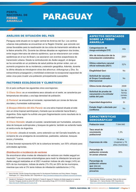 La fiebre amarilla es una enfermedad endémica en varios países de América Latina. Con vistas a brindar apoyo a los responsables de la toma de decisiones para priorizar las acciones preventivas frente a esta afección, la Organización Panamericana de la Salud presenta estos perfiles nacionales con una selección de datos concisa y exhaustiva de los países con endemicidad. En cada perfil se brinda un análisis de la situación actual del país, los factores ecológicos y climáticos asociados a la enfermedad, la distribución e incidencia de los vectores, y las claves de la actividad arboviral. Asimismo, se incluye una perspectiva histórica de la epidemiología y un resumen del estado de la vacunación contra la enfermedad en el país.