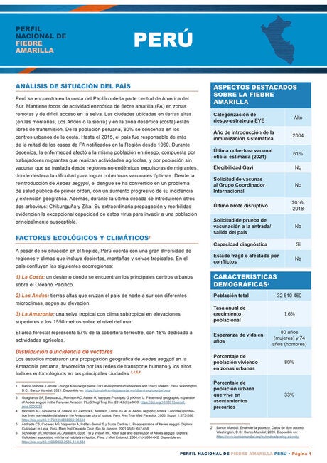 La fiebre amarilla es una enfermedad endémica en varios países de América Latina. Con vistas a brindar apoyo a los responsables de la toma de decisiones para priorizar las acciones preventivas frente a esta afección, la Organización Panamericana de la Salud presenta estos perfiles nacionales con una selección de datos concisa y exhaustiva de los países con endemicidad. En cada perfil se brinda un análisis de la situación actual del país, los factores ecológicos y climáticos asociados a la enfermedad, la distribución e incidencia de los vectores, y las claves de la actividad arboviral. Asimismo, se incluye una perspectiva histórica de la epidemiología y un resumen del estado de la vacunación contra la enfermedad en el país.