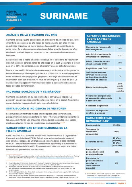 La fiebre amarilla es una enfermedad endémica en varios países de América Latina. Con vistas a brindar apoyo a los responsables de la toma de decisiones para priorizar las acciones preventivas frente a esta afección, la Organización Panamericana de la Salud presenta estos perfiles nacionales con una selección de datos concisa y exhaustiva de los países con endemicidad. En cada perfil se brinda un análisis de la situación actual del país, los factores ecológicos y climáticos asociados a la enfermedad, la distribución e incidencia de los vectores, y las claves de la actividad arboviral. Asimismo, se incluye una perspectiva histórica de la epidemiología y un resumen del estado de la vacunación contra la enfermedad en el país.