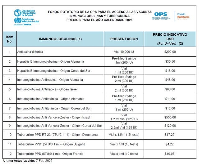 Tabla con precios de inmunoglobulinas y tuberculina del Fondo Rotatorio de la OPS para el 2025