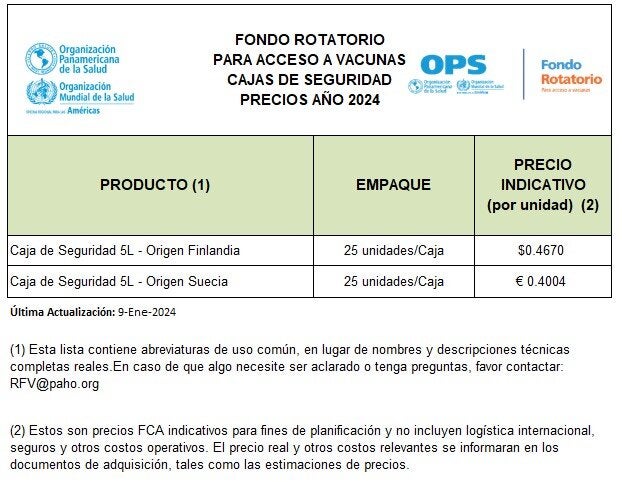 Precios cajas de seguridad 2024 del Fondo Rotatorio de la OPS