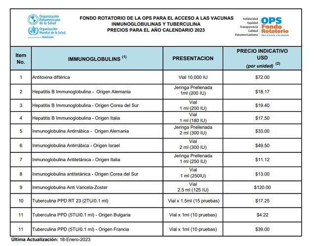 Precios de las inmunoglobulinas del Fondo Rotatorio, 2023