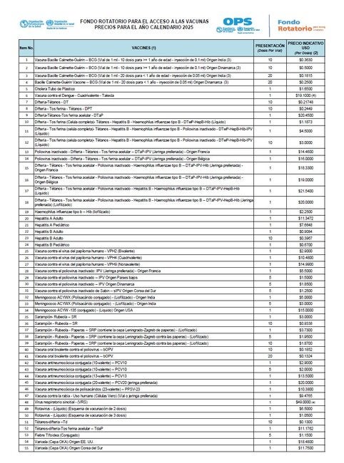 Precios de las vacunas incluidas en el portafolio del Fondo Rotatorio para Acceso a Vacunas de la OPS para el 2025