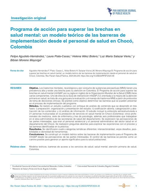 Objetivos. Los trastornos mentales, neurológicos y por uso de sustancias (SMN) tienen una alta prevalencia en Colombia y existe una brecha de tratamiento. El Programa de Acción para la Brecha en Salud Mental (mhGAP) de la Organización Mundial de la Salud (OMS) tiene varios componentes. La Guía de Intervención mhGAP 2.0, orientada a mejorar la atención primaria de salud, es una guía para la evaluación y manejo de los trastornos MNS basada en protocolos de toma de decisiones clínicas. El objetivo de este estudio fue determinar las barreras que pueden obstaculizar el proceso de implementación del programa. Métodos. Se realizó un estudio cualitativo con análisis de contenido en tres fases: i) preparación, organización y presentación del estudio; ii) codificación abierta, categorización y abstracción de contenidos; y iii) análisis de la información. El estudio incluyó entrevistas semiestructuradas a 21 personas involucradas en la prestación de servicios de salud mental en Chocó (Colombia): cinco médicos, siete enfermeras y tres psicólogos, así como a seis profesionales que laboran en el área administrativa de salud del departamento. secretarías. Se exploraron las percepciones de estas partes interesadas. Se hicieron preguntas abiertas para explorar experiencias con el proceso, así como las barreras identificadas en la práctica. Resultados. Se identificaron cuatro categorías temáticas diferentes: acción interseccional, desafíos de larga data, oportunidades e idoneidad de las herramientas. Conclusiones. Se construyó un modelo teórico de barreras para la implementación del programa mhGAP, basado en las percepciones de las partes interesadas. Controlar las barreras se percibe como una posible forma de contribuir significativamente a la salud de la población. |