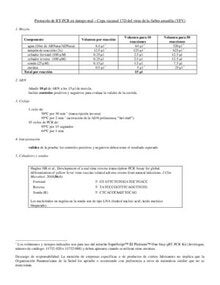 Este documento proporciona instrucciones detalladas para realizar ensayos de RT-PCR en tiempo real para detectar el virus de la fiebre amarilla, específicamente la cepa de la vacuna YFV 17D. Incluye información sobre la preparación de la mezcla maestra, las condiciones de ciclaje y la interpretación de los resultados. El protocolo está diseñado para asegurar la detección precisa y confiable del virus en varias muestras. |