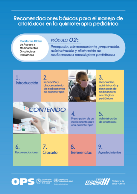 En este módulo, se describe el proceso integral de manejo de medicamentos oncológicos pediátricos, desde su recepción y almacenamiento hasta su preparación, administración y eliminación segura. Proporciona lineamientos prácticos para garantizar la calidad y seguridad en cada etapa del manejo de estos medicamentos, salvaguardando al personal y al entorno. Forma parte de la serie de módulos sobre el manejo seguro y eficaz de medicamentos citotóxicos está diseñado para fortalecer las capacidades del personal sanitario en cada etapa del proceso: desde la prescripción y preparación hasta la administración y el manejo de incidentes. Con un enfoque integral, los módulos incluyen lineamientos basados en evidencia científica para garantizar la seguridad del paciente, la protección del personal de salud y la calidad de la atención oncológica. Entre los temas abordados se destacan los conceptos básicos de la quimioterapia pediátrica, las mejores prácticas para el manejo de medicamentos peligrosos, las indicaciones terapéuticas según las patologías, y las estrategias para la gestión de eventos adversos. Este material es una herramienta clave para avanzar en la lucha contra el cáncer infantil, salvaguardando vidas y construyendo un futuro más saludable. Su desarrollo se enmarca en las actividades de la Plataforma Global de Acceso a Medicamentos Oncológicos Pediátricos, liderada por la Organización Mundial de la Salud (OMS) y St. Jude Children’s Research Hospital, con la colaboración de la OPS y otros socios, para garantizar el acceso oportuno y de calidad a medicamentos esenciales para el cáncer pediátrico. El desarrollo de este material fue posible gracias a la colaboración de la Organización Panamericana de la Salud (OPS) y el Ministerio de Salud Pública del Ecuador, el primer país de las Amméricas en implementar la Plataforma |