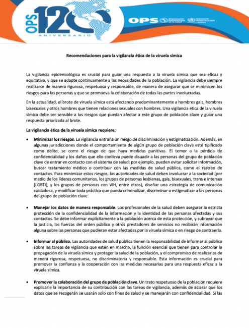 La vigilancia es una actividad esencial de la salud pública. Sin embargo, la vigilancia entraña desafíos éticos. El brote de viruela símica afecta predominantemente a hombres gais, hombres bisexuales y otros hombres que tienen relaciones sexuales con hombres. La vigilancia de la viruela símica, de manera específica, entraña los riesgos de discriminación y estigmatización, además del riesgo de las medidas punitivas en las jurisdicciones donde el comportamiento de algún grupo de población clave esté tipificado como delito. Una conciencia sobre estos riesgos y una orientación específica para abordar otros desafíos éticos son necesarias para promover la vigilancia ética de la viruela símica. Esta breve publicación da recomendaciones orientadas a asegurar que la vigilancia de la viruela símica sea realizada de manera ética. Las recomendaciones han sido elaboradas sobre la base de las pautas de la OMS sobre la ética en la vigilancia de salud pública.