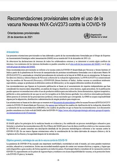 Estas recomendaciones provisionales de la OMS para el uso de la vacuna COVID-19 Novavax NVX-CoV2373 se elaboraron sobre la base del asesoramiento emitido por el Grupo Consultivo Estratégico de Expertos en Inmunización (SAGE) y el resumen de pruebas incluido en el documento de referencia y los anexos.
