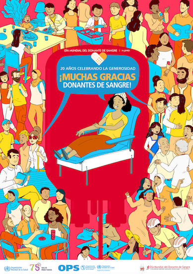 La campaña mundial de este año tiene como lema “20 años celebrando la generosidad: ¡Muchas gracias, donantes de sangre!”, en conmemoración del hito del vigésimo aniversario y el profundo impacto que tiene la donación de sangre en la vida de pacientes y donantes. Esta campaña brinda la oportunidad de dar las gracias a las personas de todo el mundo que salvan vidas con sus donaciones de plasma sanguíneo y plaquetas. La campaña además hace un llamamiento a la acción, para motivar a más personas a que se unan al movimiento mundial de donación de sangre. |