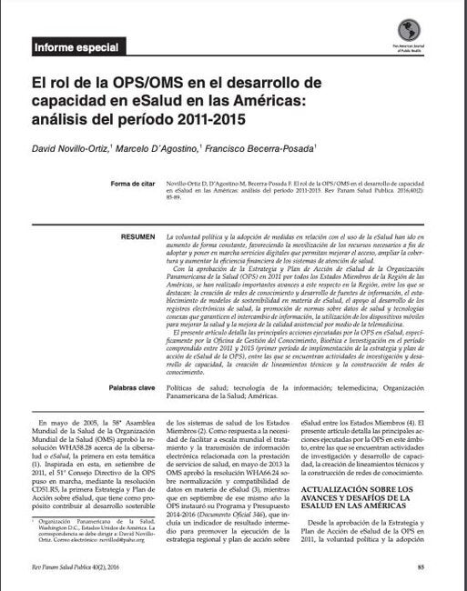 La voluntad política y la adopción de medidas en relación con el uso de la eSalud han ido en aumento de forma constante, favoreciendo la movilización de los recursos necesarios a fin de adoptar y poner en marcha servicios digitales que permitan mejorar el acceso, ampliar la cobertura y aumentar la eficiencia financiera de los sistemas de atención de salud. Con la aprobación de la Estrategia y Plan de Acción de eSalud de la Organización Panamericana de la Salud (OPS) en 2011 por todos los Estados Miembros de la Región de las Américas, se han realizado importantes avances a este respecto en la Región, entre los que se destacan: la creación de redes de conocimiento y desarrollo de fuentes de información, el establecimiento de modelos de sostenibilidad en materia de eSalud, el apoyo al desarrollo de los registros electrónicos de salud, la promoción de normas sobre datos de salud y tecnologías conexas que garanticen el intercambio de información, la utilización de los dispositivos móviles para mejorar la salud y la mejora de la calidad asistencial por medio de la telemedicina. El presente artículo detalla las principales acciones ejecutadas por la OPS en eSalud, específicamente por la Oficina de Gestión del Conocimiento, Bioética e Investigación en el período comprendido entre 2011 y 2015 (primer período de implementación de la estrategia y plan de acción de eSalud de la OPS), entre las que se encuentran actividades de investigación y desarrollo de capacidad, la creación de lineamientos técnicos y la construcción de redes de conocimiento.