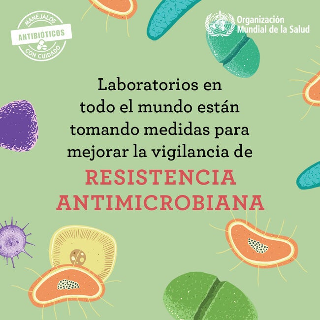 Semana Mundial de Concientización sobre el Uso de los Antibióticos 2018: Postal para redes sociales. "Laboratorios están tomando medidas para..."