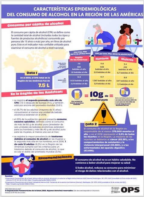 Esta hoja informativa presenta datos sobre la epidemiología del alcohol desglosados por población total, según consumo per cápita y sexo en la Región de las Américas. Incluye estadísticas relacionadas con el consumo de alcohol, la morbilidad y la mortalidad; así como el indicador de consumo de alcohol per cápita, con información sobre las bebidas consumidas por año y por día. Concluye con algunas recomendaciones e incorpora una breve lista de referencias utilizadas para elaborar el contenido.