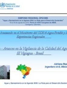 Avanzando en el Monitoreo del ODS-6. Agua Potable y Saneamiento. Experiencias Regionales. Avances en la Vigilancia de la Calidad del Agua Potable. El Vigiagua, Brasil- Adriana Rodrigues Cabral, Ministerio de Salud, Brasil. Simposio Regional: Agua y Saneamiento en la Agenda 2030: La Ruta para el Desarrollo Sostenible. |
