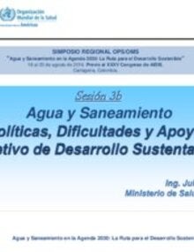 Agua y Saneamiento Políticas, Dificultades y Apoyos Objetivo de Desarrollo Sustentable 6- Ing. Julio Monreal, Ministerio de Salud de Chile. Simposio Regional: Agua y Saneamiento en la Agenda 2030: La Ruta para el Desarrollo Sostenible. |