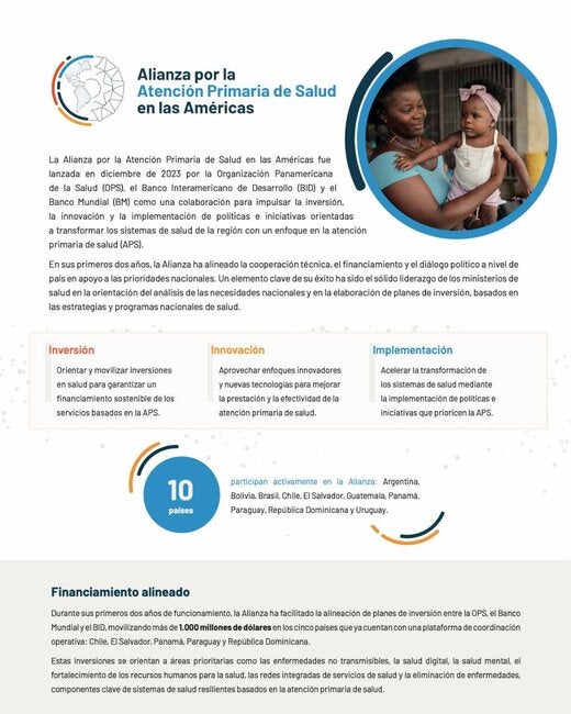 La Alianza por la Atención Primaria de Salud en las Américas fue lanzada en diciembre de 2023 por la Organización Panamericana de la Salud (OPS), el Banco Interamericano de Desarrollo (BID) y el Banco Mundial (BM) como una colaboración para impulsar la inversión, la innovación y la implementación de políticas e iniciativas orientadas a transformar los sistemas de salud de la región con un enfoque en la atención primaria de salud (APS). En sus primeros dos años, la Alianza ha alineado la cooperación técnica, el financiamiento y el diálogo político a nivel de país en apoyo a las prioridades nacionales. Un elemento clave de su éxito ha sido el sólido liderazgo de los ministerios de salud en la orientación del análisis de las necesidades nacionales y en la elaboración de planes de inversión, basados en las estrategias y programas nacionales de salud. |
