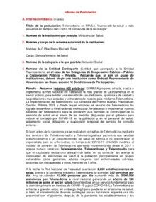 La implementación de Telemedicina fue ganadora del Premio Buenas Prácticas en Gestión Pública 2019 y desde aquel entonces el servicio de Telemedicina ha logrado expandirse a nivel nacional, evolucionar, fortalecerse e implementar nuevos servicios de Telemedicina para la población que permiten la continuidad de la atención de salud en el marco de las medidas dispuestas por el gobierno para reducir el contagio por COVID-19 en la población y en el personal de salud: aislamiento social obligatorio y suspensión temporal del servicio de consulta externa. |