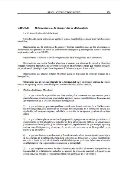 La 58ª Asamblea Mundial de la Salud, Considerando que la liberación de agentes y toxinas microbiológicos puede tener ramificaciones mundiales; Reconociendo que la contención de agentes y toxinas microbiológicos en los laboratorios es fundamental para prevenir los brotes de enfermedades emergentes y reemergentes como el síndrome respiratorio agudo severo (SRAS); Reconociendo la labor de la OMS en la promoción de la bioseguridad en el laboratorio; Reconociendo que varios Estados Miembros sí cuentan con sistemas de control y directrices eficaces en materia de prácticas de laboratorio con el fin de gestionar el riesgo que entrañan los agentes y toxinas microbiológicos para los trabajadores de laboratorio y para la comunidad; Reconociendo que algunos Estados Miembros quizá no dispongan de controles eficaces de la bioseguridad; Observando que el enfoque integrado de la bioseguridad en el laboratorio, incluida la contención de los agentes y toxinas microbiológicos, promueve la salud pública mundial, INSTA a los Estados Miembros... |