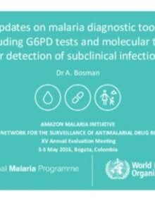 Updates on malaria diagnostic tools, including G6PD tests and molecular tools for detection of subclinical infections - A. Bosman; 2016