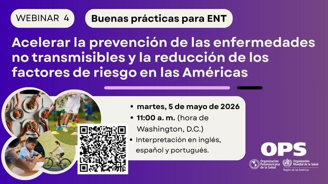 Acompáñenos el martes 5 de mayo de 2026 a las 11:00 a. m. (EST) en el seminario web Acelerar la prevención de las enfermedades no transmisibles y la reducción de los factores de riesgo en las Américas, el cuarto seminario web de la serie regional «Mejor Atención para las ENT». Este seminario web ayudará a identificar y difundir buenas prácticas y estrategias clave que están acelerando las respuestas de los países para prevenir las ENT, fortalecer la alineación con la Iniciativa para una Mejor Atención para las ENT y promover su replicabilidad y ampliación, con especial atención a la equidad y los determinantes sociales.