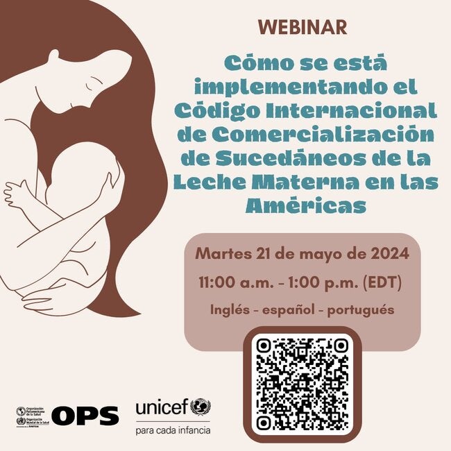 Únase a nosotros el martes 21 de mayo de 2024 a las 11:00 a. m. (Washington D.C. o EDT) para participar del webinar: Cómo se está implementando el Código Internacional de Comercialización de Sucedáneos de la Leche Materna en las Américas. El webinar se llevará a cabo el Día Mundial de la Protección de la Lactancia Materna, celebrado anualmente el 21 de mayo, que destaca la importancia crítica de la implementación del Código Internacional de Comercialización de Sucedáneos de la Leche Materna y las resoluciones referentes posteriores de la Asamblea Mundial de la Salud.