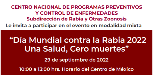 Participe con nosotros el jueves, 29 de septiembre de 2022, en el evento conmemorativo por el Día Mundial contra la Rabia 2022 - Una Salud, Cero muertes.
