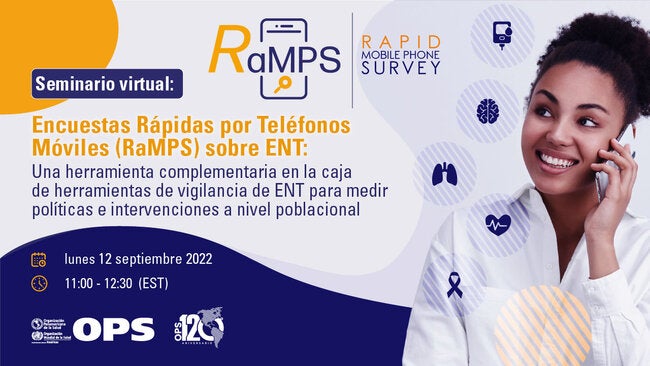 Participe con nosotros el lunes, 12 de septiembre de 2022, en el seminario virtual "Encuestas Rápidas por Teléfonos Móviles (RaMPS) sobre ENT", en el que se abordará la experiencia y efectividad de las encuestas rápidas por teléfono móvil para recolectar datos oportunos sobre políticas e intervenciones en ENT, y en el que se presentará la experiencia de implementación de encuestas telefónicas en diferentes países.