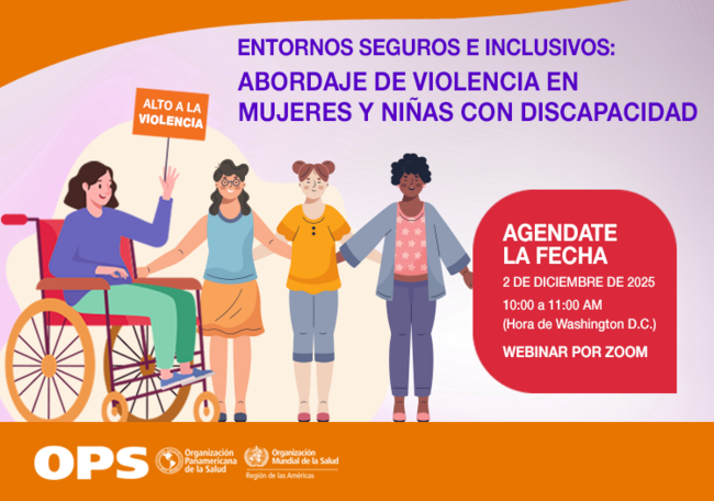 Acompáñenos el martes 2 de diciembre a las 10:00 a. m. (hora de Washington, D.C. o EST) en el evento "Entornos seguros e inclusivos: abordaje de violencia en mujeres y niñas con discapacidad". Durante el evento se analizarán las causas y factores de riesgo que contribuyen a la violencia contra las mujeres y las niñas con discapacidad, con el propósito de comprender mejor las dinámicas que la perpetúan.