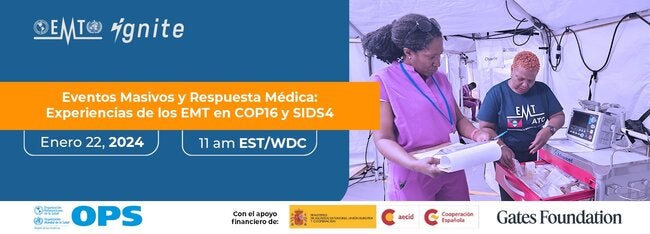 Participa en el webinar EMTignite: "Eventos Masivos y Respuesta Médica: Experiencias de los EMT en COP16 y SIDS4" que se realizará el miércoles 22 de enero del 2025 a las 11:00 am EST/WDC.