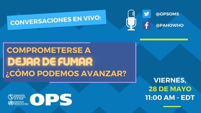 El viernes 28 de mayo, a las 11:00 AM (EDT), la OPS realizará una sesión de conversaciones en vivo con el título "Comprometerse a dejar de fumar, ¿cómo podemos avanzar?". Esta sesión se enmarca en las actividades organizadas por con ocasión del "Día Mundial sin Tabaco", que se conmemora cada 31 de mayo. La sesión se transmitirá simultáneamente a través de las cuentas de la OPS en Facebook en @PAHOWHO. y Twitter en @opsoms.