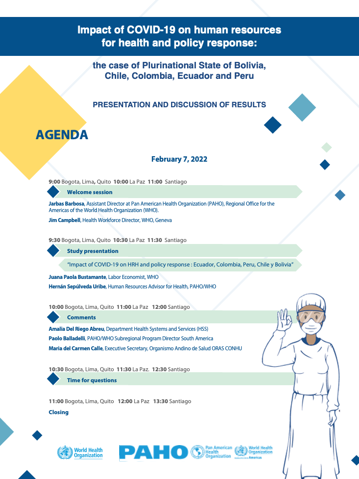 QUÉ: Presentación y discusión de los resultados del informe "Impacto de la COVID-19 en los recursos humanos para la salud y respuesta de política: el caso del Estado Plurinacional de Bolivia, Chile, Colombia, Ecuador y el Perú: síntesis de hallazgos en cinco países de América Latina¨