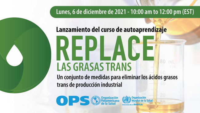 Le invitamos a participar en el lanzamiento del curso de autoaprendizaje “REPLACE las grasas trans: Un conjunto de medidas para eliminar los ácidos grasos trans de producción industrial” el lunes, 6 de diciembre de 2021, de las 10:00 am a las 12:00 pm (EST).