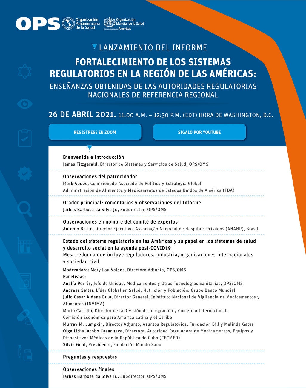 La Organización Panamericana de la Salud (OPS/OMS) lanzará en una reunión virtual el informe “Fortalecimiento de los sistemas regulatorios en la Región de las Américas: Enseñanzas obtenidas de las autoridades regulatorias de referencia regional”.