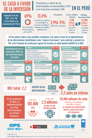 El jueves 24 de junio se realizará un evento virtual organizado conjuntamente por el Ministerio de Salud de Perú, la Organización Panamericana de la Salud y el Programa de las Naciones Unidas para el Desarrollo (PNUD) en el que se presentará el Estudio de caso a favor de la inversión de la prevención y el control de las enfermedades no transmisibles (ENT) y trastornos mentales en el Perú.
